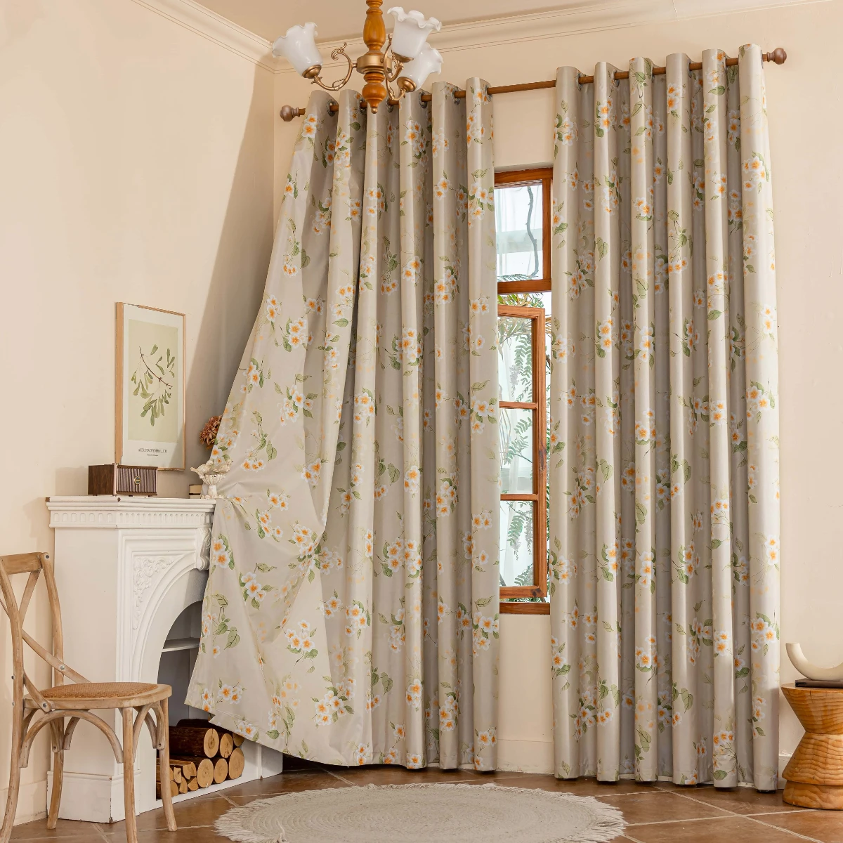 1 Piece of New Laminated Beige Background Curtain with Small Floral Print, 100% Blackout Fabric for Home Use, Blackout and Heat-Insulating Thickened Curtain, Decorative Rod-Pole Curtains for Living Room, Bedroom, and Study